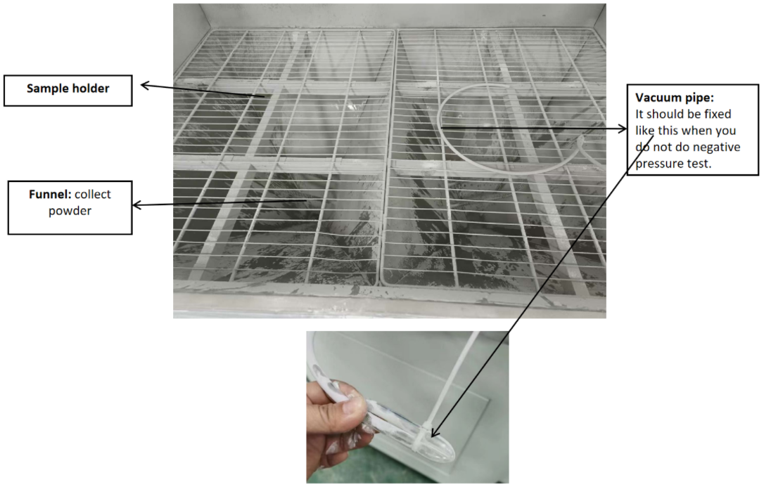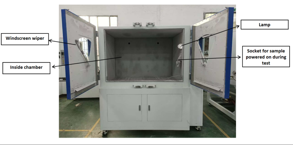 Dust Test Chamber is equipped with air blower device to stir the dust and blow it into the sealed test chamber. Sample vacuum device is optional for IP5X dustproof test; and the sample should be connected with vacuum pump to pump out the air inside sample for IP6X dustproof test, so that the air can enter into sample through the gap, sleeve or other similar parts.
